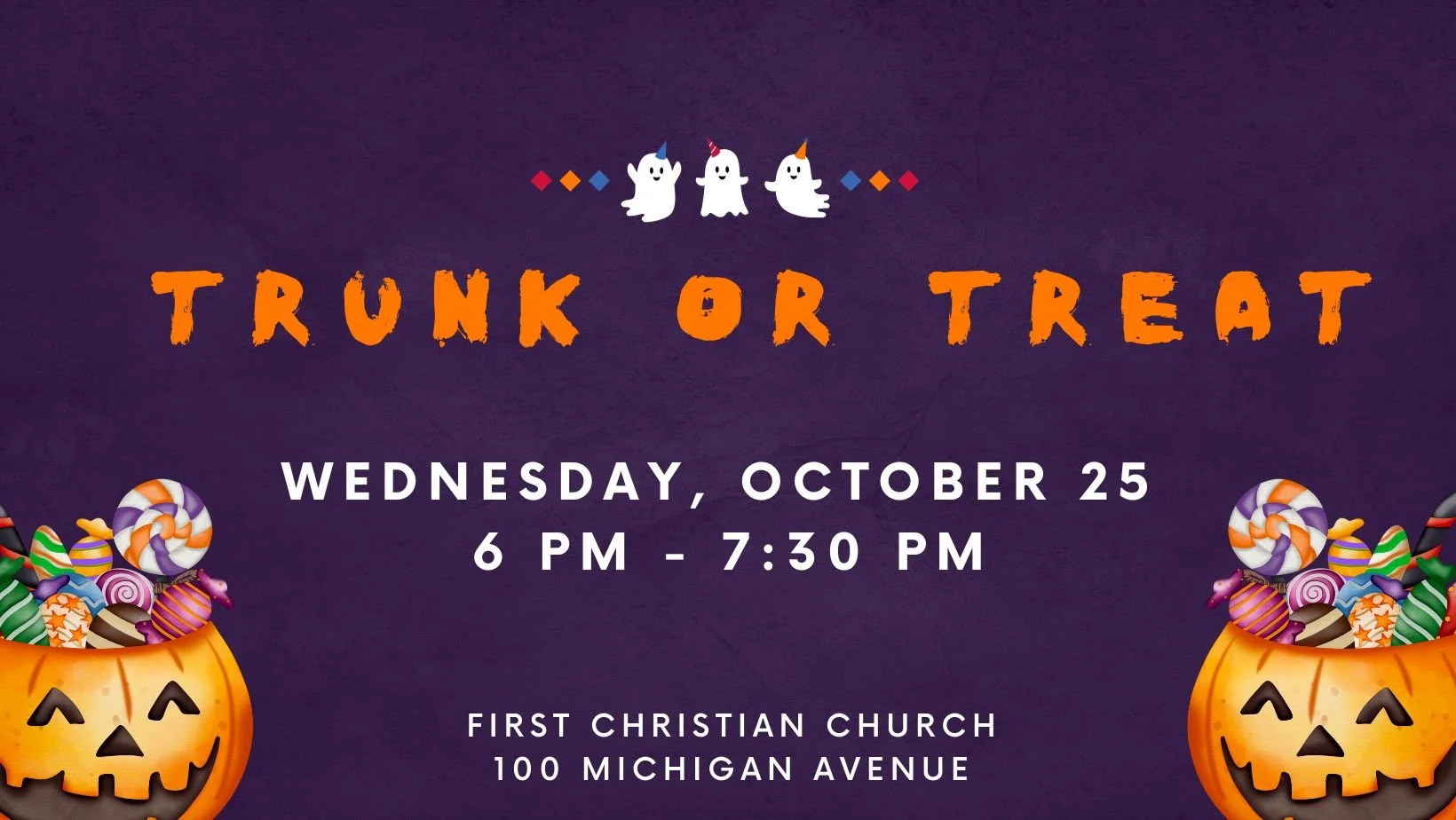 Trunk or Treat Wednesday, October 25, 2023 6:00 PM 7:30 PM 18:00 19:30 First Christian Church 108 Michigan Avenue Monticello, KY, 42633 United States (map) Google Calendar ICS